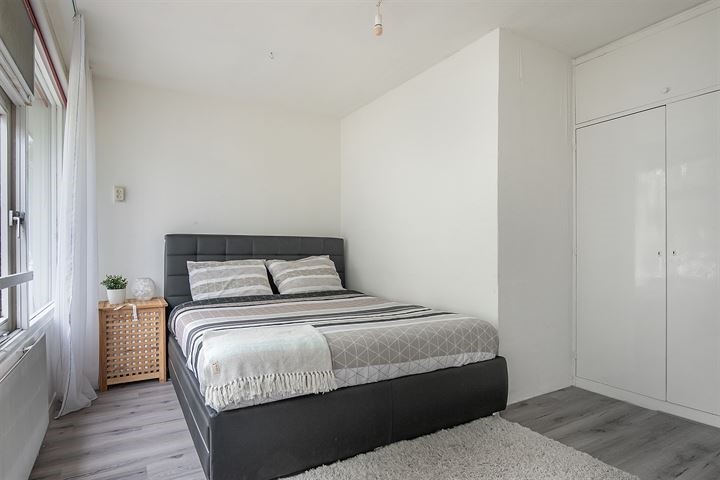 Via de trap kom je op de lichte en ruime woonverdieping. Op deze etage vind je een gezellige woonkamer waar je heerlijk tot rust kunt komen na een drukke dag. Schuif aan bij het raam met uitzicht over het straatbeeld of voel je vrij om de ruimte in te delen zoals jij wilt. De open woonkeuken ademt gezelligheid en leent zich uitstekend als centrale ontmoetingsplek. Het keukenblok is eenvoudig, maar vormt tegelijkertijd een blanco canvas voor eigen creativiteit. Het separate toilet op deze verdieping is voorzien van een fontein.